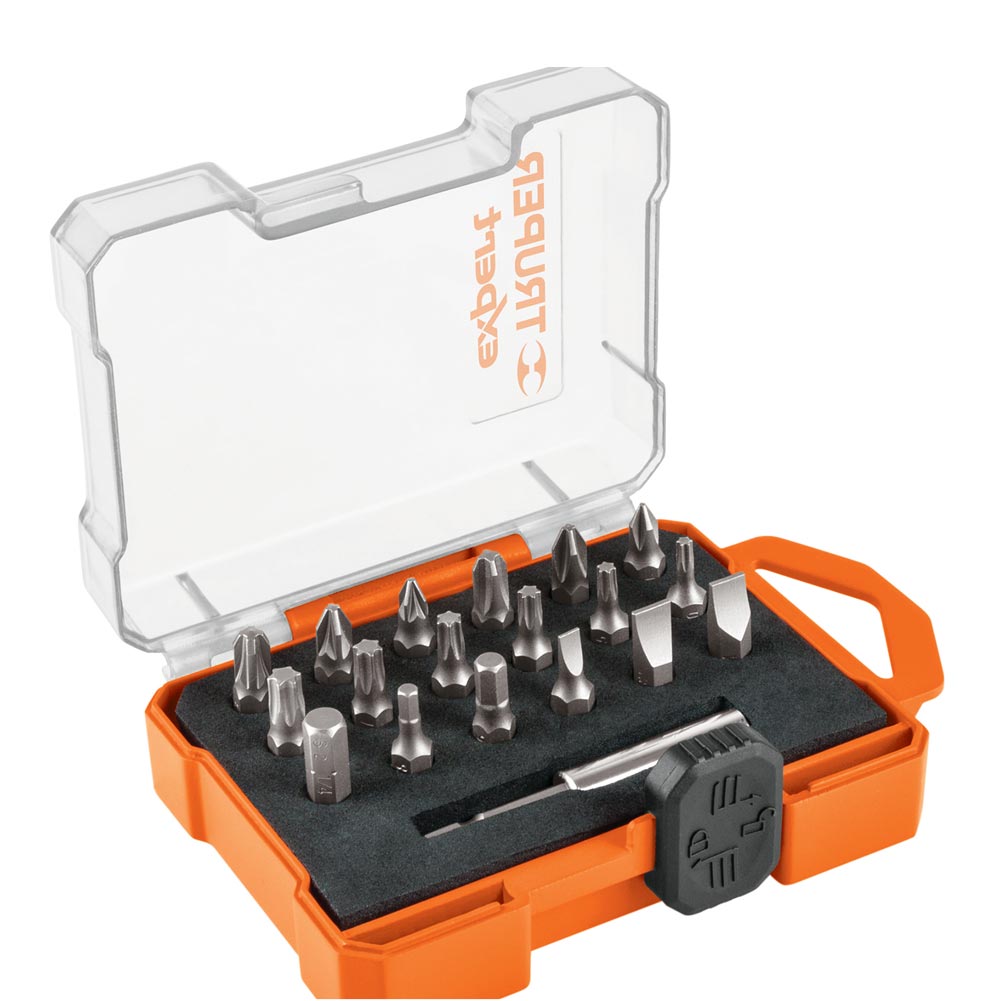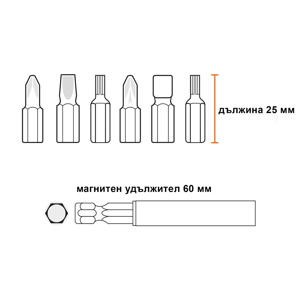 Комплекта съдържа: 3 кръстати бита, 3 плоски бита, 3 бита Pozidriv, 3 шестостенни бита, 6 Торкс