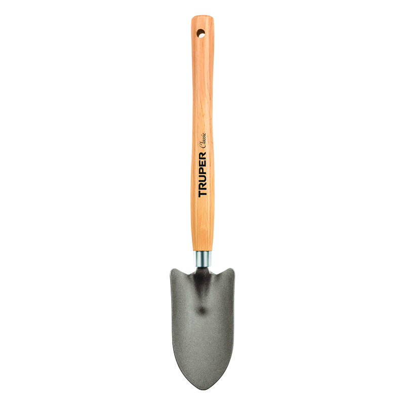 Малка лопата с дълга дървена дръжка, идеална за обработка на малки градини и пространства.