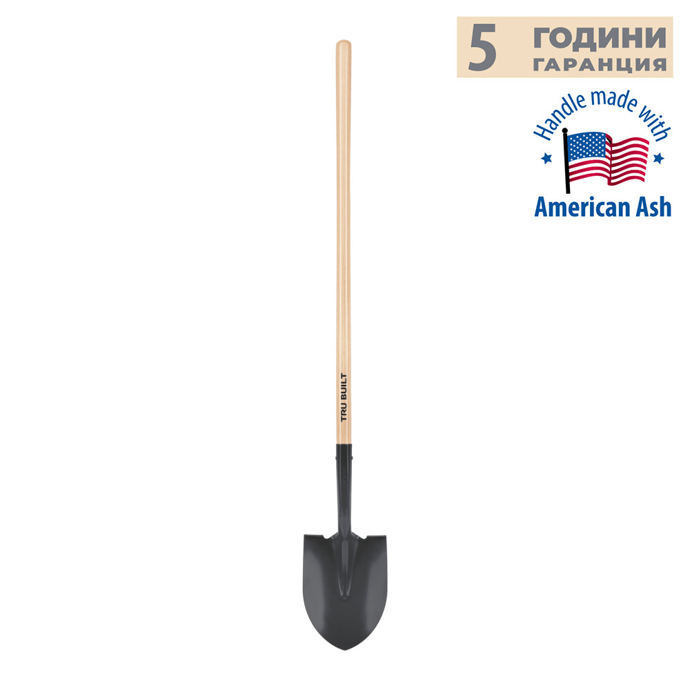 Здрава и издръжлива обла лопата с дръжка от твърда ясенова дървесина и лаково покритие. Устойчива на голям натис и усилена работа. С рамене за поставяне на стъпалата и по-добър контрол при работа.