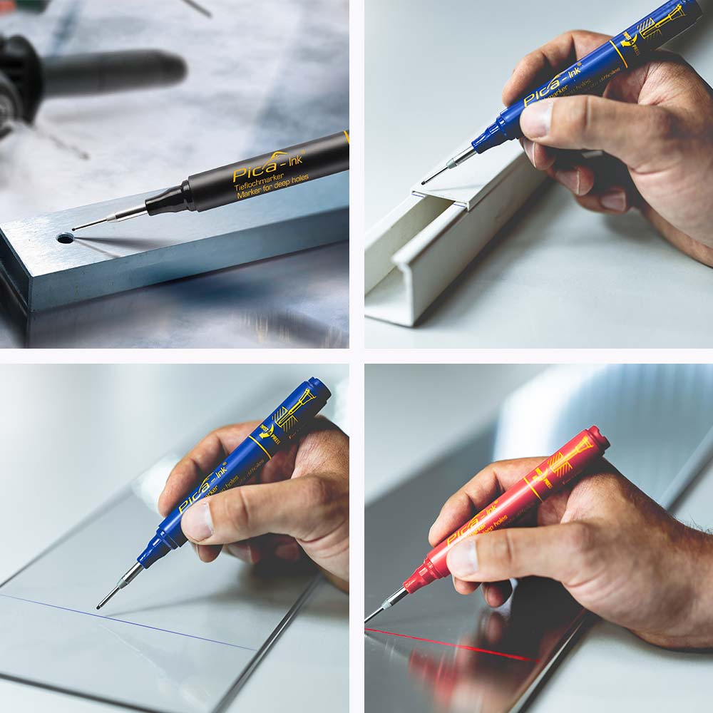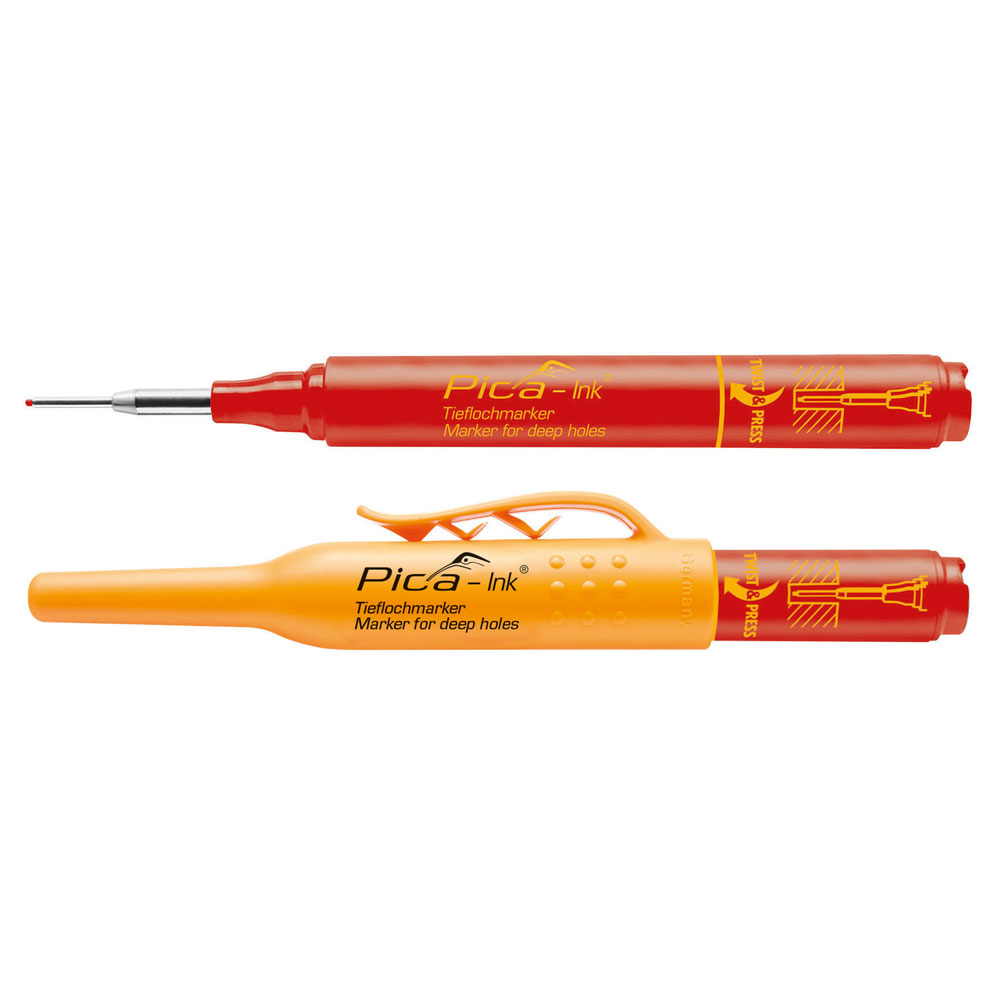 Перманентен маркер за дълбоки отвори с червен мастилен писец PICA Ink позволява многократно завъртане на писеца, така че да се използва цялото мастило. Оставя ярка и трайна следа. Подходящ за метал, дърво, стъкло, пластмаса и много други материали. Удобната капачка LONGLIFE позволява бърза работа с една ръка.