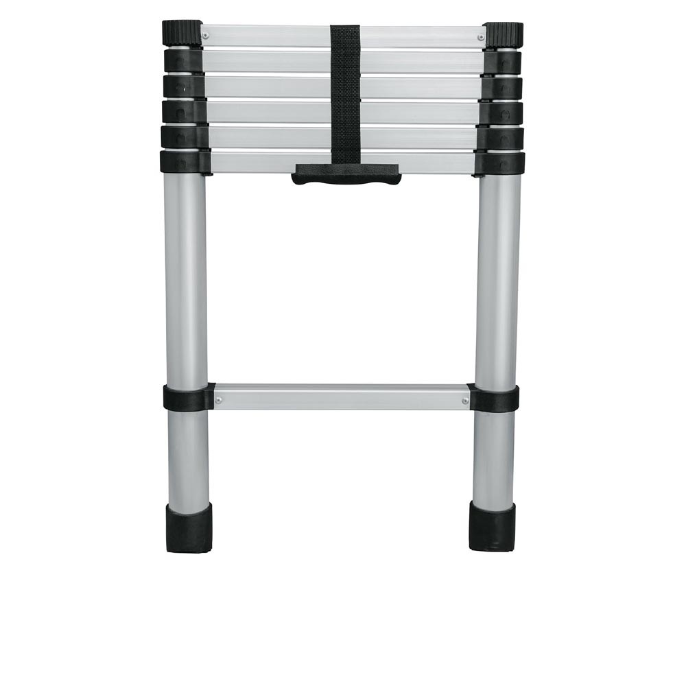 Телескопична стълба, изработена от лек алуминий със 7 стъпала. Лесно настройване на желаната височина, благодарение на плъзгащите се заключалки на стъпалата. Максималното разгъване е до 2 метра.